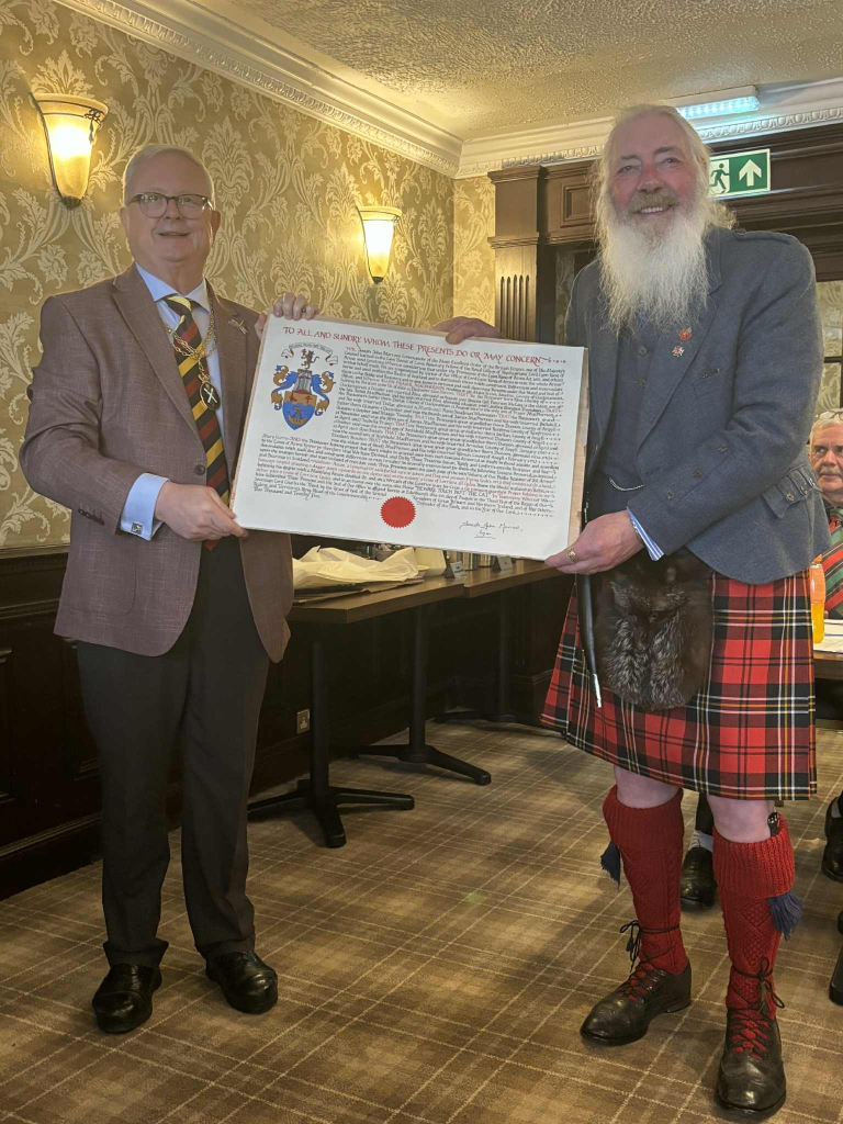 We are delighted to be able to report that our own Committee Member, Euan MacPherson, was earlier today at the AGM of the Royal Scottish Highland Games Association where he was presented by Lord Lyon with his own individual Arms immediately following upon the presentation of Arms to the RSHGA. Image is of the formal handover.